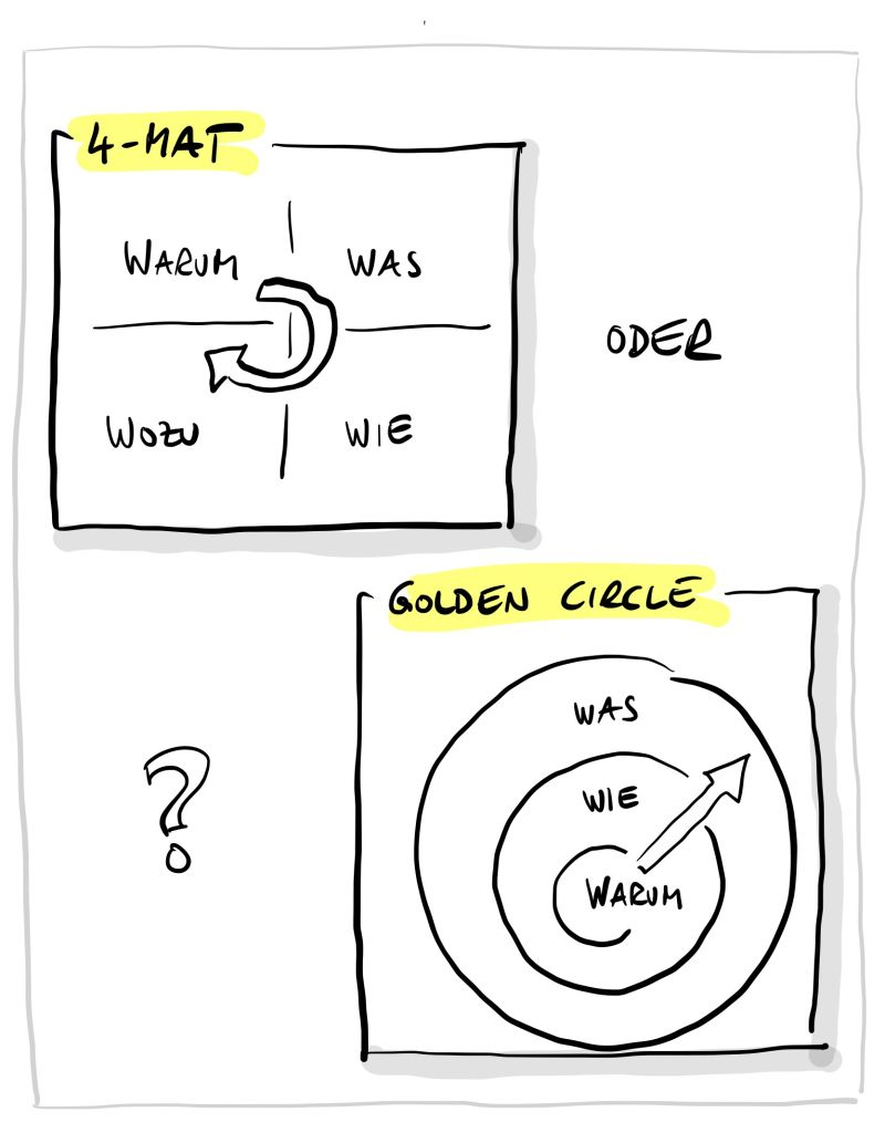 Communication example for 4-MAT: “Ich brauche dein Feedback. Das ist meine Idee. So will ich sie umsetzen. Damit könnten wir x erreichen. Was meinst Du?”