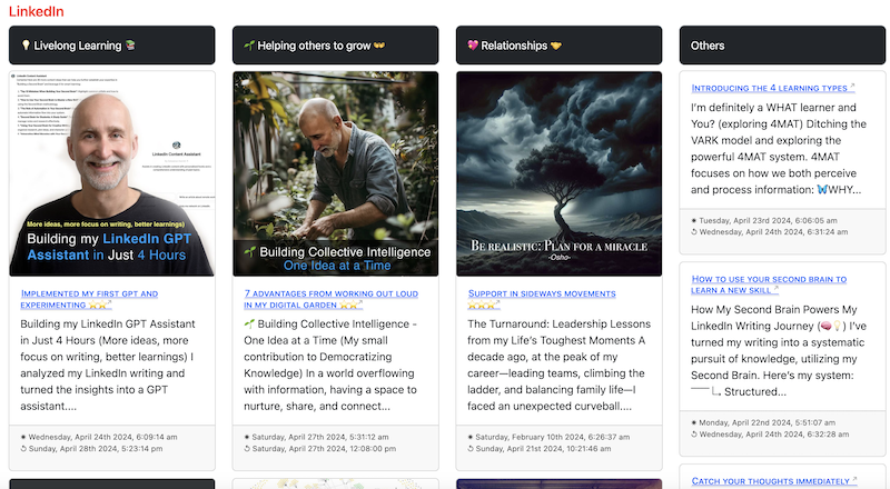 Do you also find it difficult to remember posts on LinkedIn. And does your saved item list grow more an more? I implemented a solution to get an overview of all my LinkedIn post, enriched with further deep dive information per post, linked with further knowledge. Now all available in my digital garden 🌱.