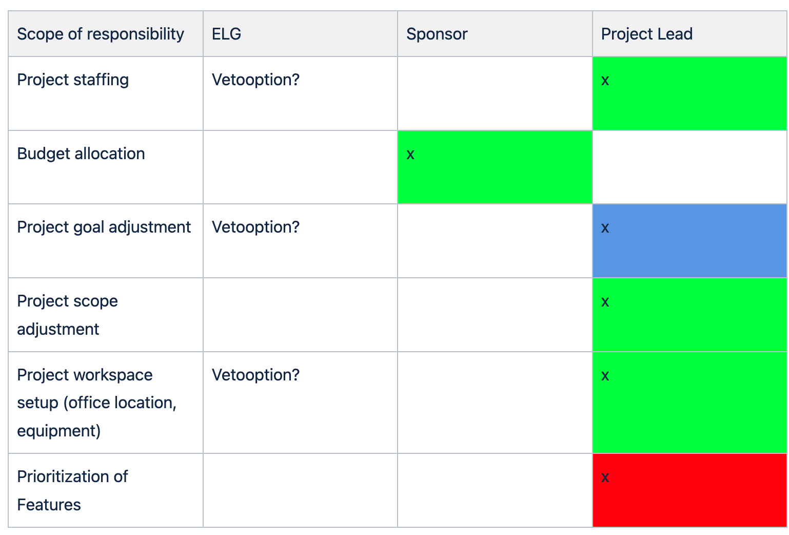 The following example explains delegation between ELG, Sponsor and Project Lead. The Project Lead can further delegate to roles of the Project. The delegation to the Project Lead does not override Role and Circle specific accountabilities and domains of functions across the Organization.