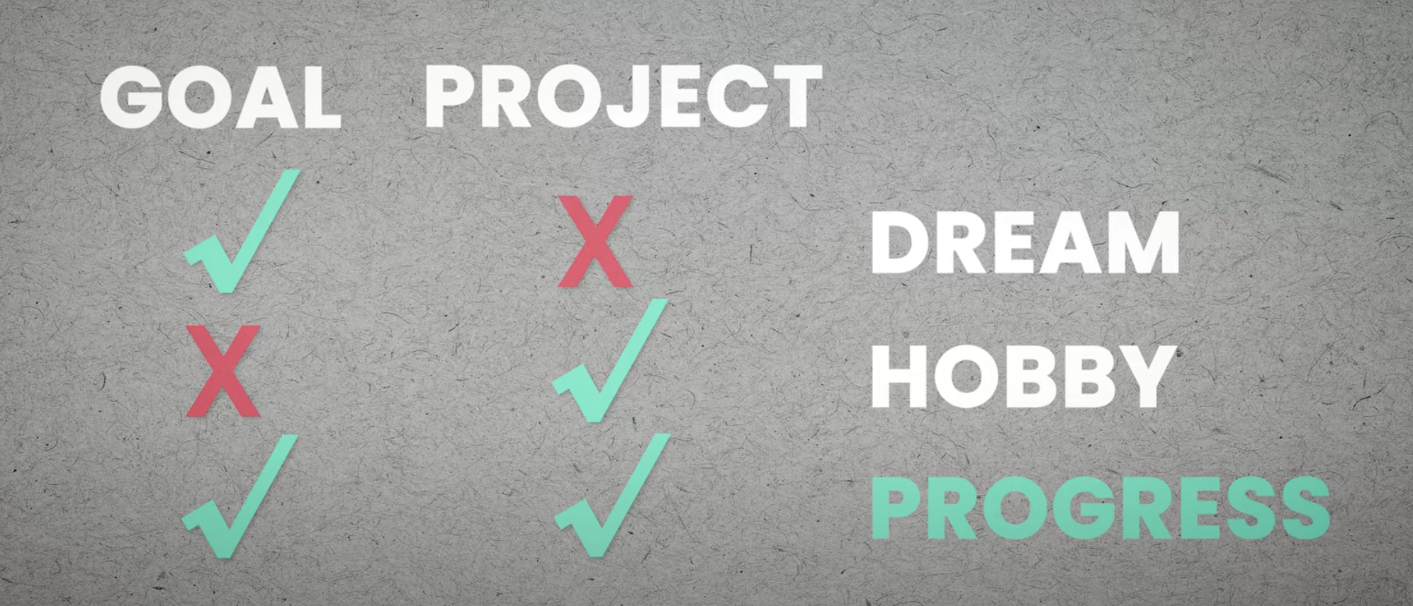 Nice short video about goal setting - https://www.youtube.com/watch?v=xrc_x–re04 + it starts after setting the goals + the project is the vehical that gets you there + a project with no associated goal - is a hobby + a goal without a project - is a dream