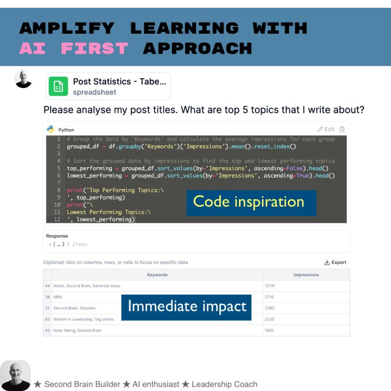 Just yesterday I had another eye opening moment with AI. For my post about LinkedIn statistics I was using Julius.ai for the data analysis and creating charts. I provided my dataset and asked questions about my data. And I provided some expert input for the analysis to be done. I watch Julius.ai generating Python code that analyzed the data and that created charts. And I remember just some years ago and my learning journey to understand R and Python to work better with data. It was difficult to find the right functions to call and I invested a lot of time debugging, scrolling endless documentation, reading Goggle insights. The change now: With watching Julius.ai generating such code on the fly, I could use that for learning how to implement that for myself too. I watch some example code unfold and was just impressed how much better I got the context and how these examples would have helped me to learn the data analysis much faster and easier.