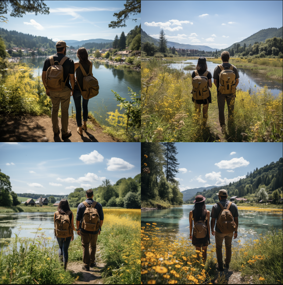 Output: Landscape photography Subject: A couple, age around 40 years, in love, visible from their backs Background: Looking on a river with blue sky and beautiful, colorful nature Influences: Holiday photography Emphasisers: Yellow and green Cameras: Carl Zeiss Distagon 115 mm f/2.8 zn --s 750
