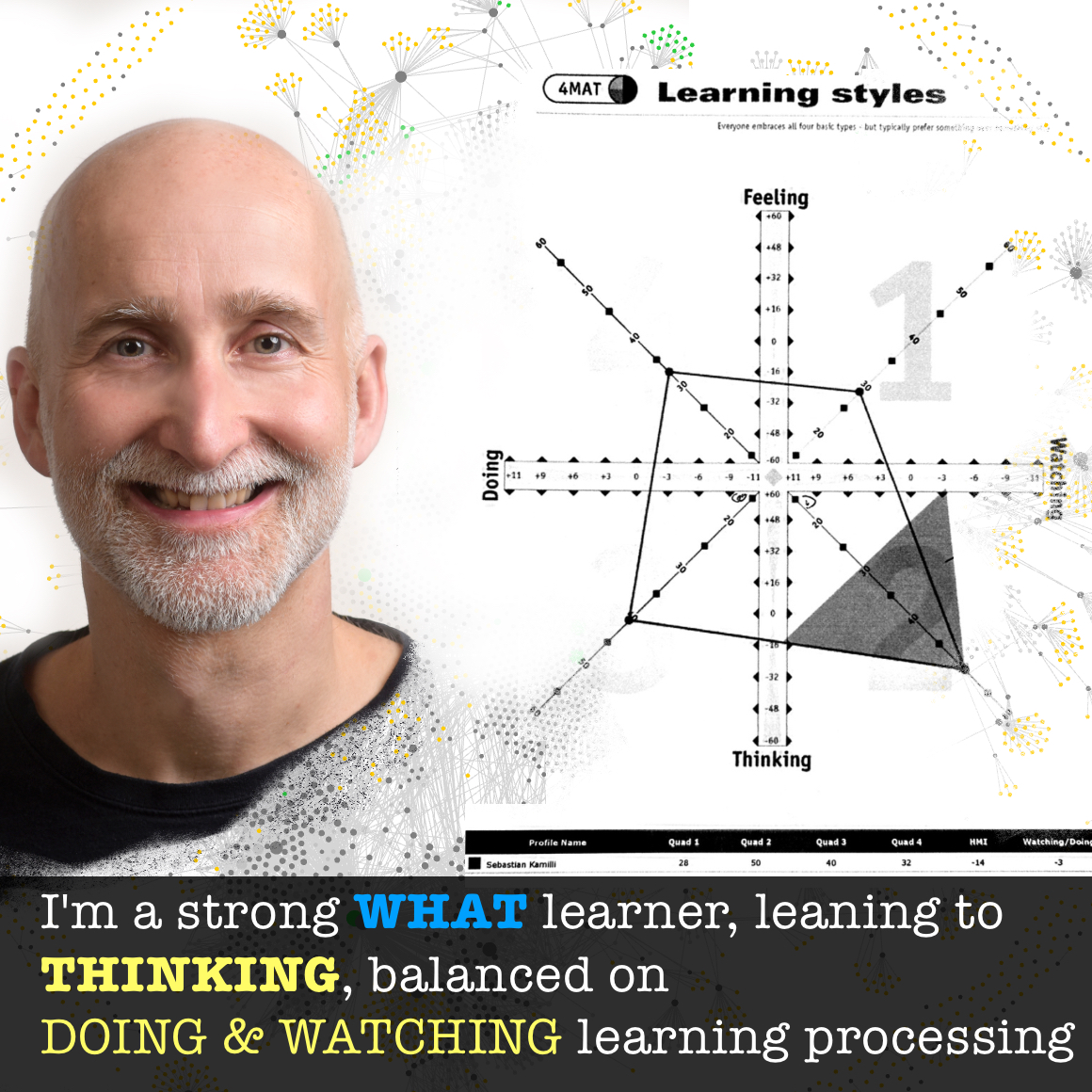 Based on 4MAT Learning Types I’m a strong WHAT learner - Style 2 - Analytic. I’m leaning towards thinking, involving my left brain hemisphere. When I learn I’m balanced between Doing/Exercising and Watching/Observing.