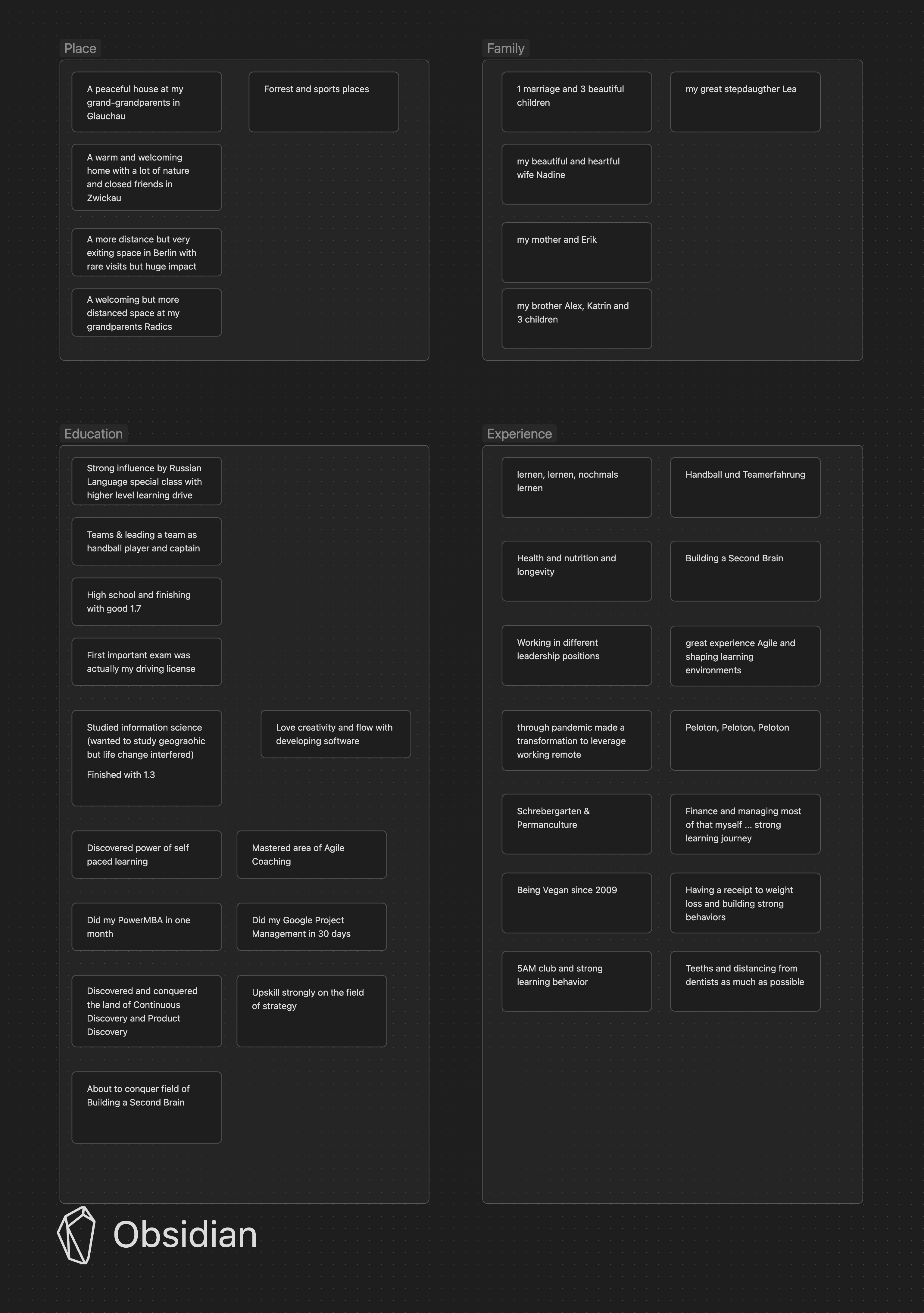 🌱 (seedling) | Permanent note | ✷ 2024-06-07 21:08 ↺ 2025-06-25 06:10 My experience map - learning during BASB Linking [[My experience Map.canvas]] MOC Building a 2nd brain Notes mentioning this note There are no notes linking to this note.