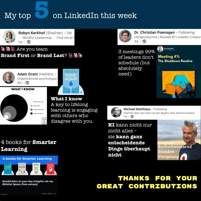 My top 5️⃣ LinkedIn Insights this Week 💡 (Unknown, Brand,📚 for Smarter Learning, ❌🤖, missing Leader Meetings)