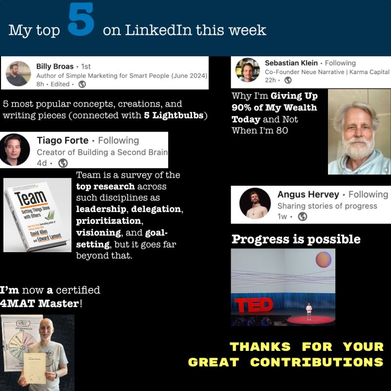 My top 5️⃣ LinkedIn Insights this Week 💡 (PROGRESS, wealth❓, TEAM ,💡💡💡💡💡,4MAT)