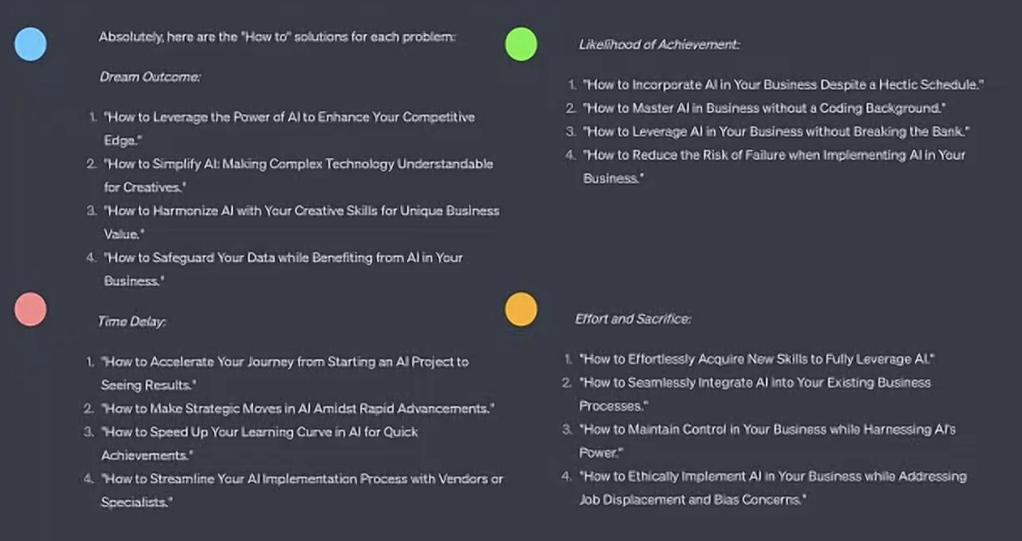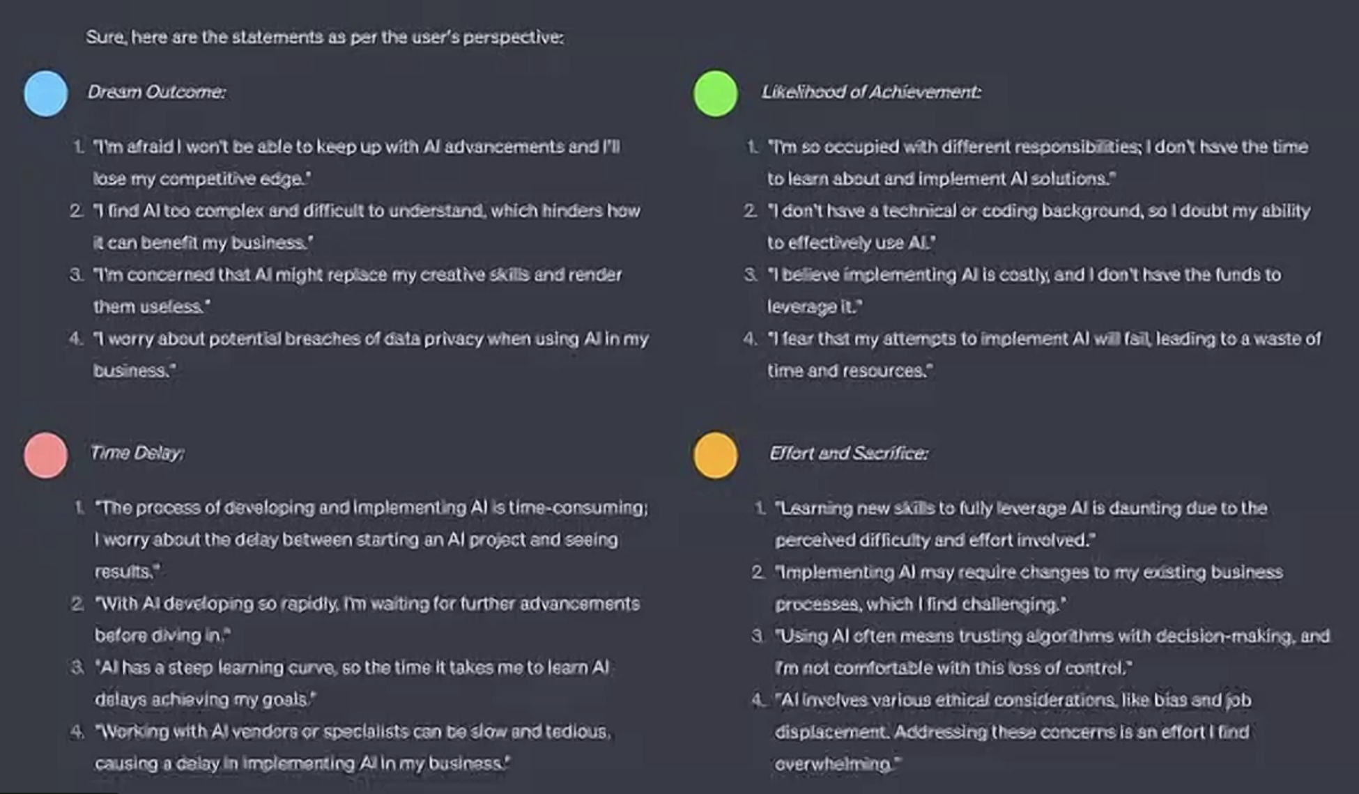 *Dream Outcome: problems around Al. The market segment I want to focus on is creative entrepreneurs who use content marketing. -Perceived undesired outcomes? -Perceived obstacles? Example: I am scared of the advancement of Al Here is the exercise. Write 4 problems for each variable of the value equation. *Likelihood of achievement Perceived reasons for non achievement? example: I am already so far behind that I never catch up. • Time Delay -Perceived delays between effort and outcome? example: It will take me too long to learn a new tech skill. *Effort and sacrifice -Perceived difficult efforts required? example: New technology is too complex for me to learn.