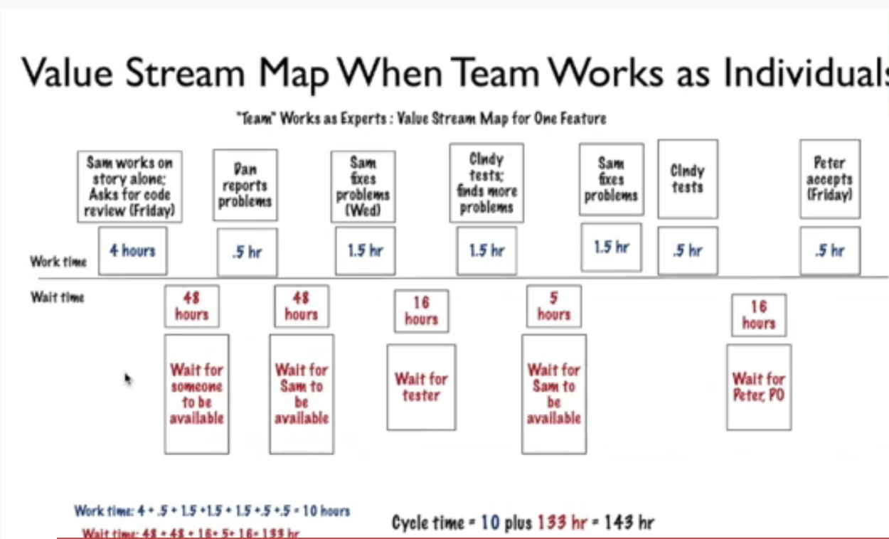 A simple value stream map and showing how a team is collaboration on a topics. It shows work time, wait time and cycle time in a way one can start to think about optimizations.