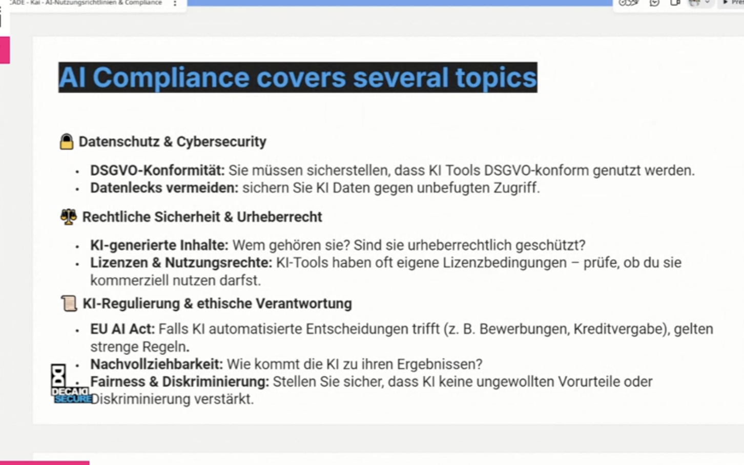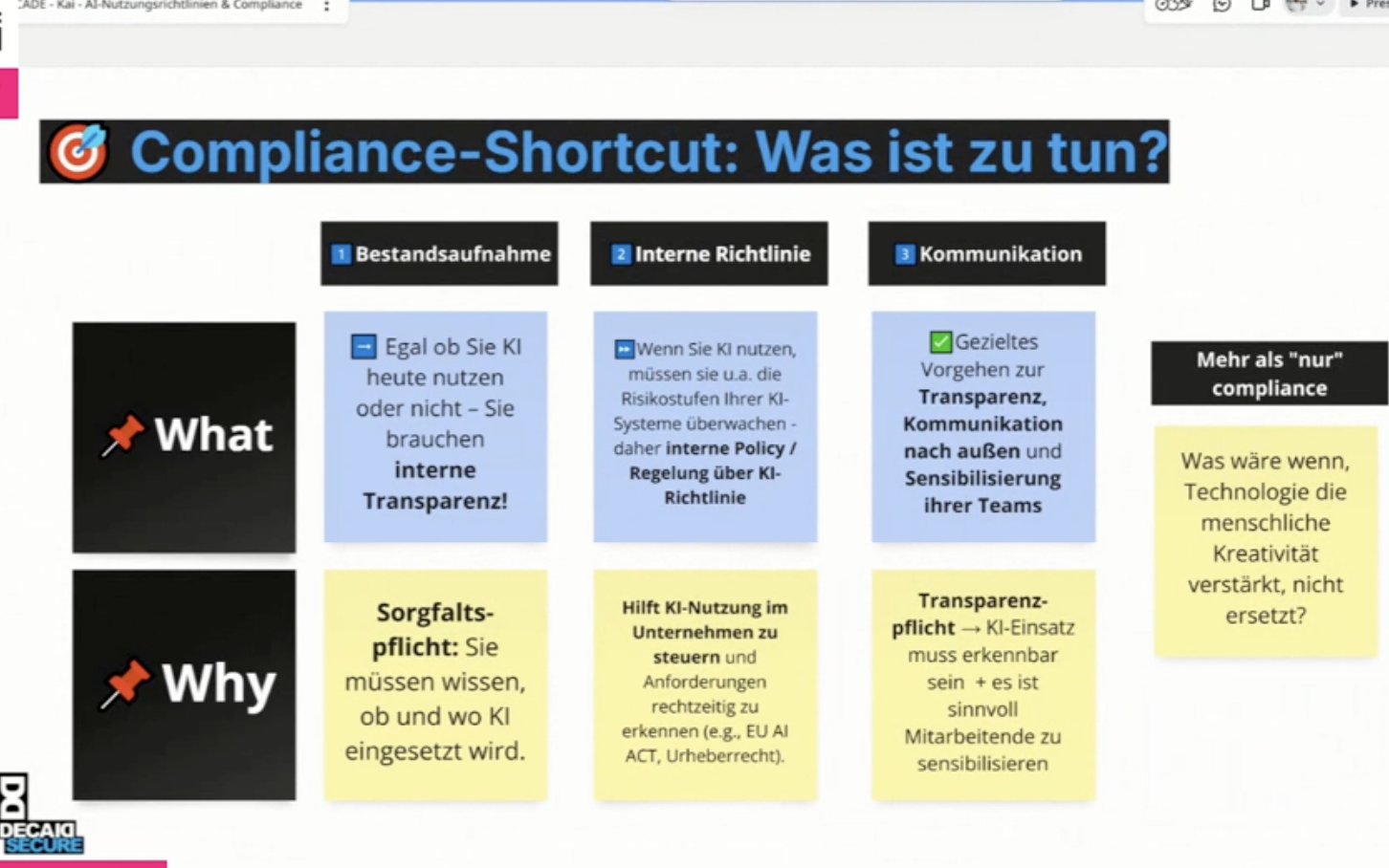 - Helps manage AI usage within the company and enables timely recognition of regulatory requirements (e.g., EU AI Act, copyright).