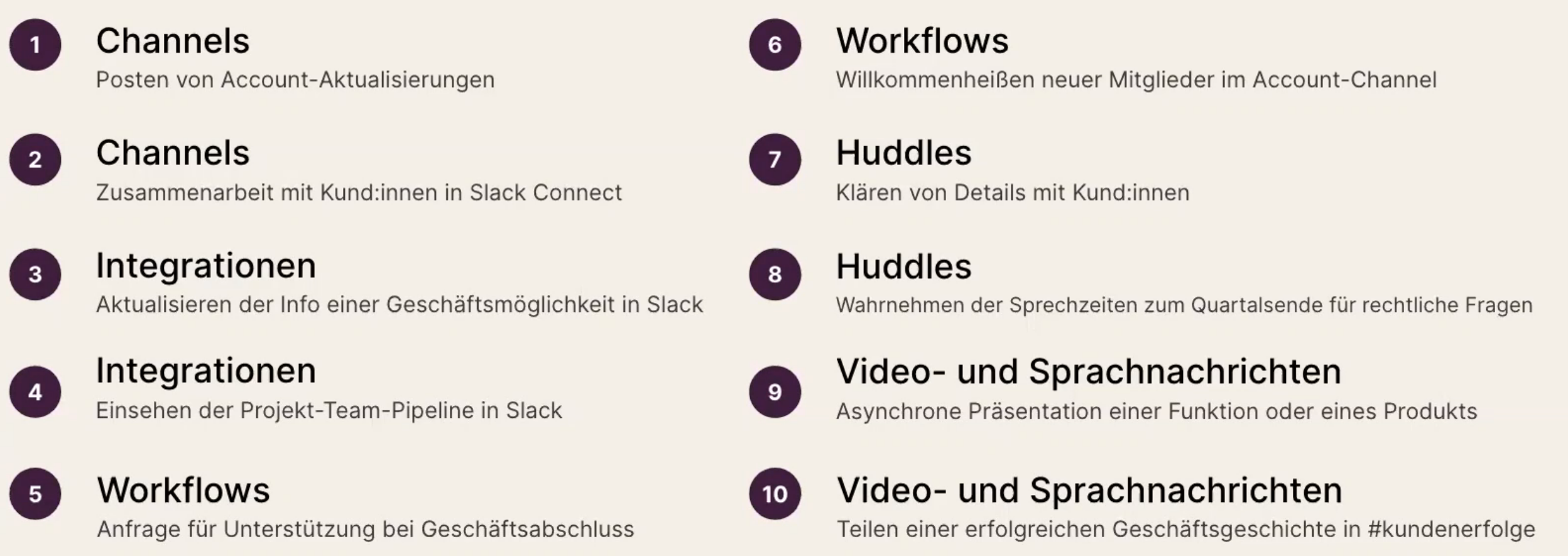 - integrate with Apps and push information from App (e.g. Jira, Salesforce, ,…) to Slack