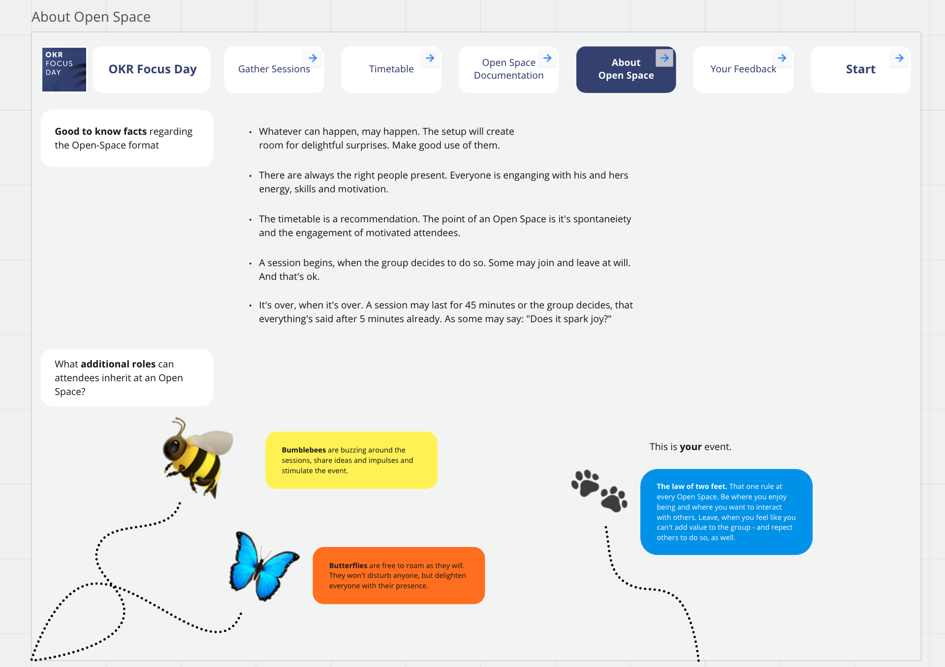 🌰 (nut) | ✷ 2024-06-07 21:08 ↺ 2025-06-25 06:10 Open Space - Description for Miro Source Great crosslinking inside Miro between the timetable and the notes sections Nice Layout for Open Space Planning Room notes capturing Notes mentioning this note There are no notes linking to this note.