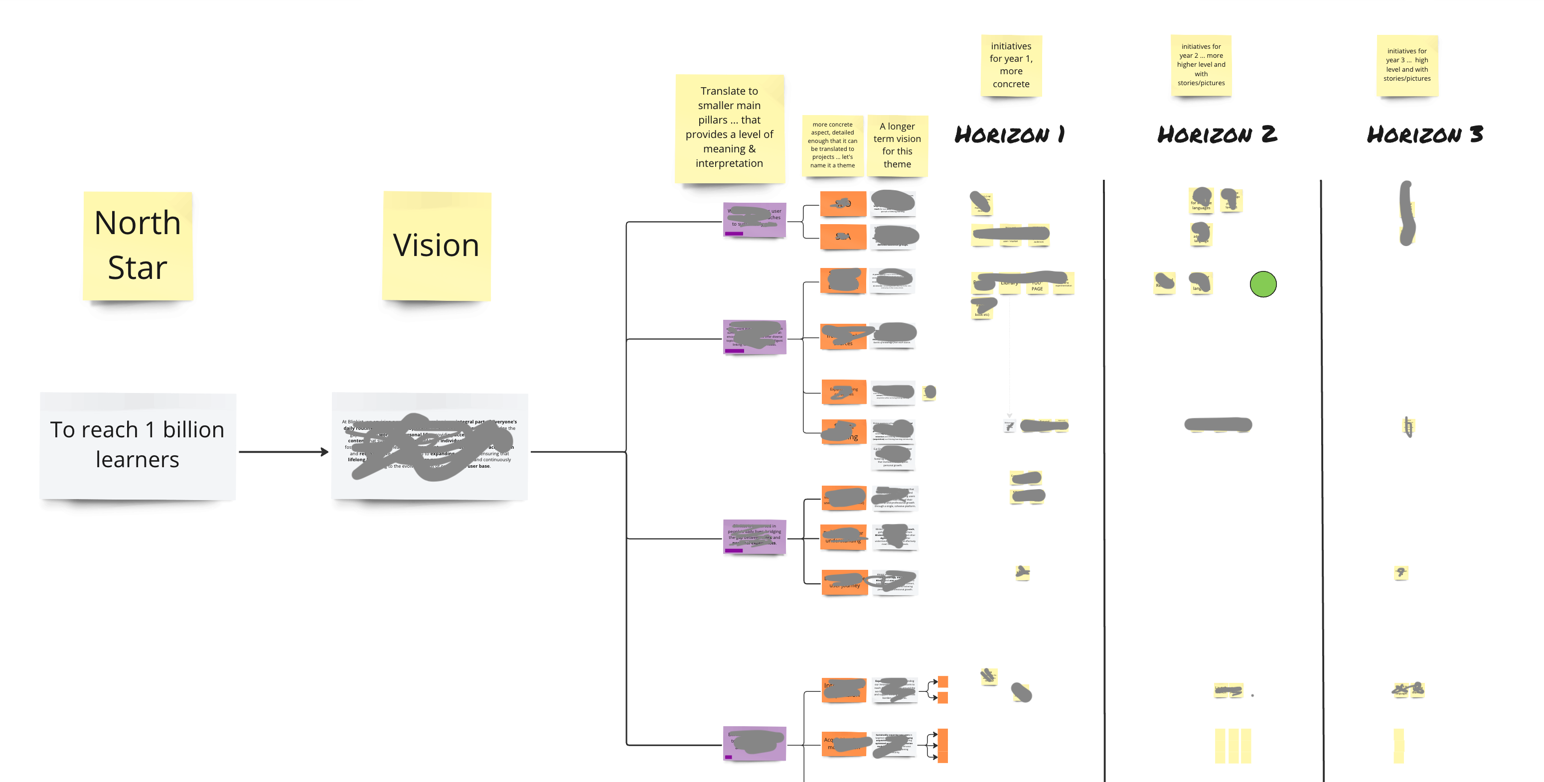 The approach to work backwards from the company vision (markers) to more concrete sub-vision per bigger endavours/themes seems to work, well. Each theme can then be filled with initiatives/projects on the horizons.