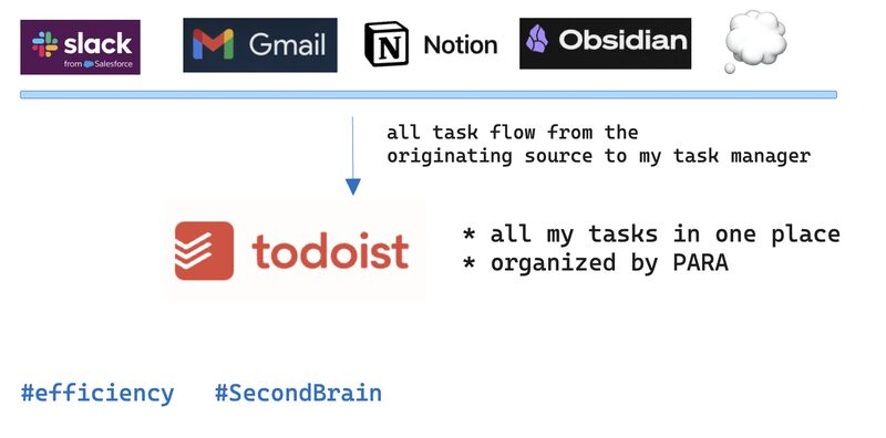 - All systems where my tasks originate from are connected to my Todoist. When I realize a task from a Slack conversation, I create that task in Todoist directly from Slack. When I derive a task from an E-Mail, I create the task in Todoist in the E-Mail app. When I have a team shared task in Notion or Asana, that task is automatically mirrored to my Todoist.