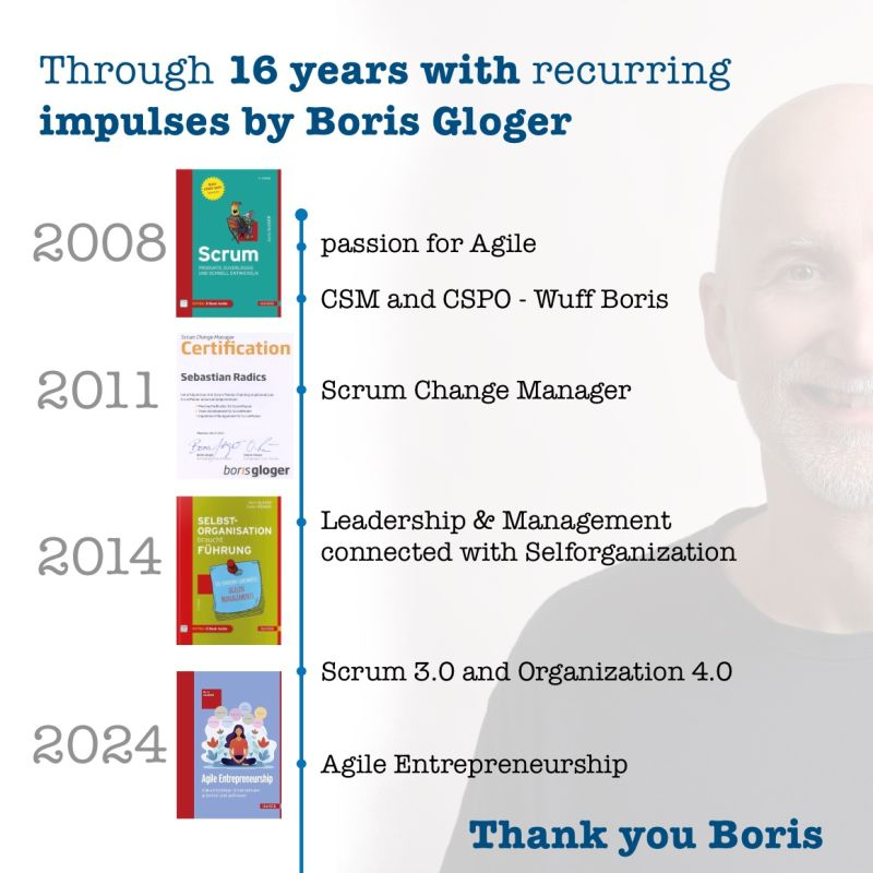 I currently read Boris Gloger’s latest book Agile Entrepreneurship. I read about two thirds already and it made me reflect. I want to use that opportunity to thank you Boris, for being one of the most influential persons for my career.