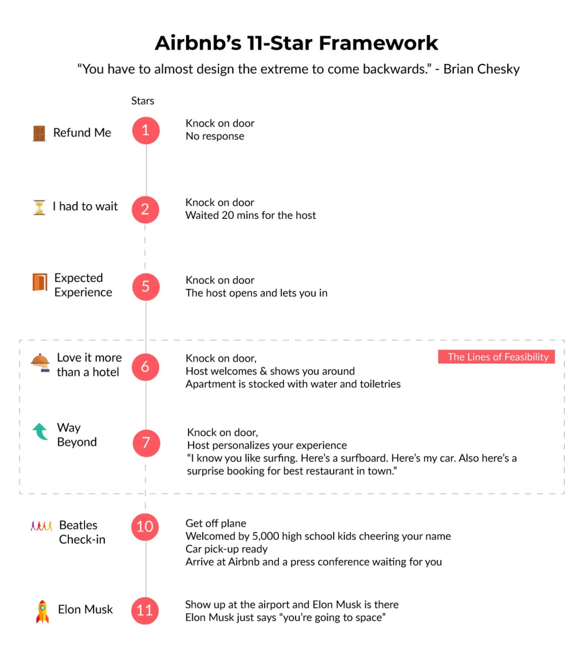 The “11-star experience” is a concept that Brian Chesky, co-founder and CEO of Airbnb, developed to describe the level of service and hospitality that he wanted his company to provide to its customers. Chesky believed that in order to truly differentiate Airbnb from other travel companies, they needed to go above and beyond in terms of customer service and satisfaction.