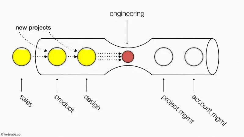no company should take on more work than their bottleneck can process. The job of management is to determine the capacity of their bottleneck, fill it, and then allow no more projects to begin until one is completed.