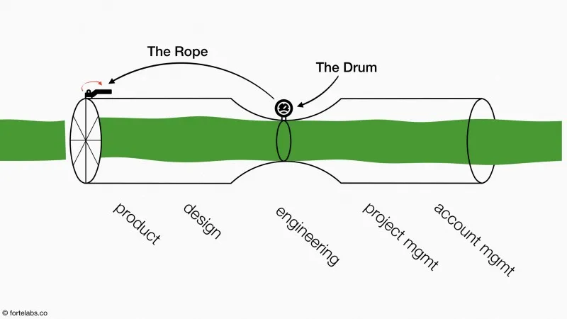 DBR is designed to enforce this: the processing rate of the bottleneck is the “Drum” that determines the pace at which the entire system should work (like a drummer in a marching band helping the whole group step in sync). The “Rope” is the signal that “pulls” a new item of work into the pipe only when an item is processed by the bottleneck (the same role played by Ford’s belts and Ohno’s kanban cards earlier).