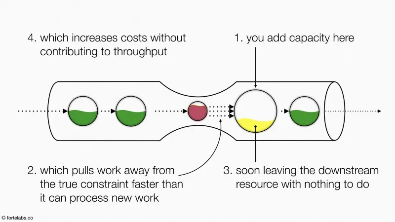 Note that the economics of doing so are completely different than for the typical hire: it makes sense to hire even extremely expensive or extremely unproductive resources, because every unit of capacity at the constraint is worth the throughput of the whole organization. But because adding any capacity is extremely expensive in terms of time and money, we do it as a last resort, instead of a first resort.