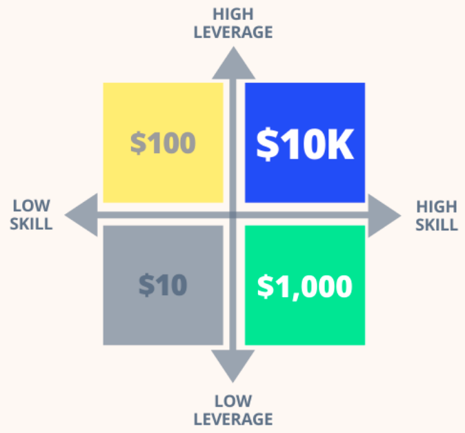 $1000tasks. - Lastly, $10K work. It’s hard to pin down, but a good starting point is this question: if I think about where I want to be in 1, 5 or 10 years, what will actually get me there?