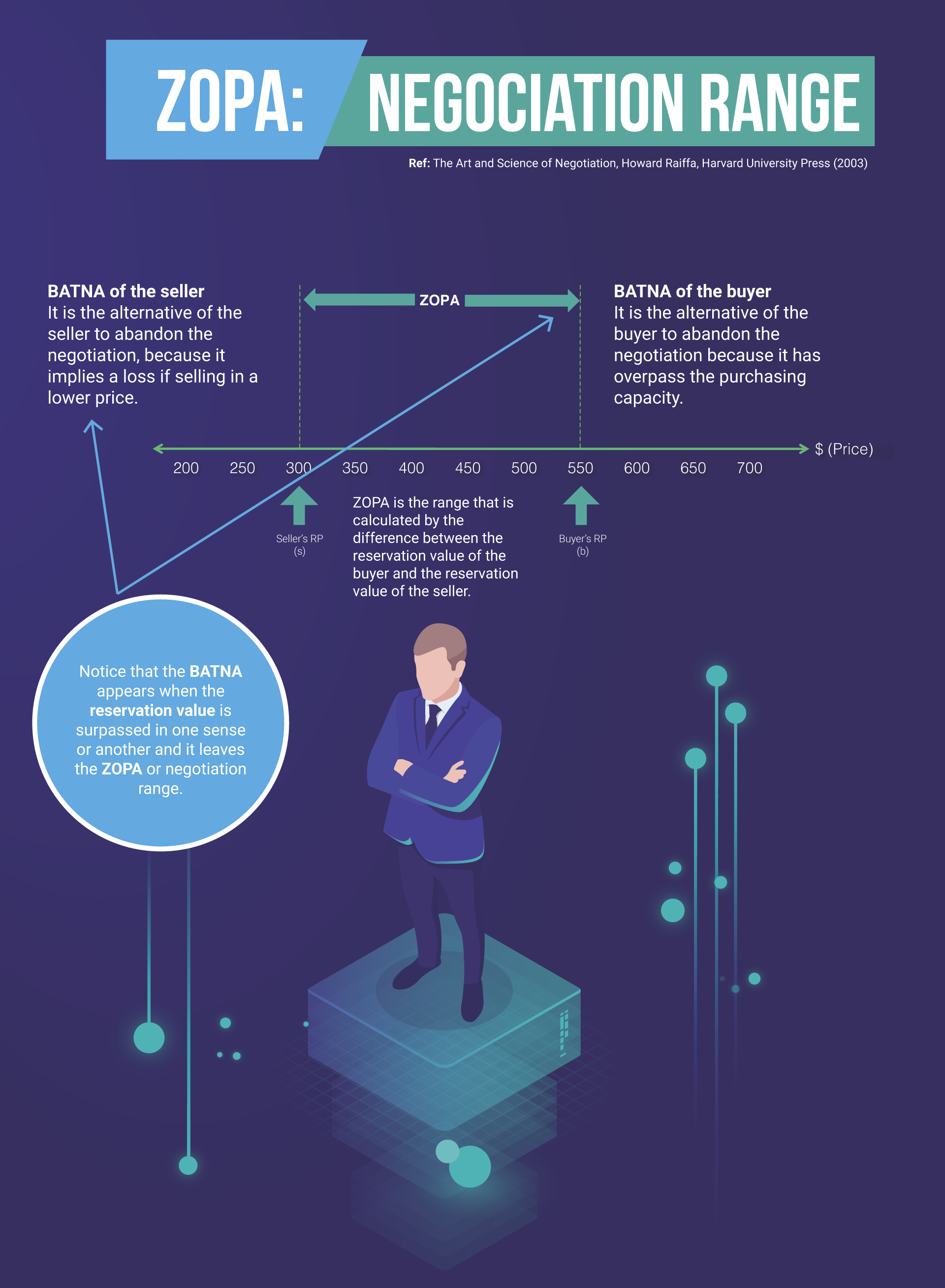 First an example and then you can find detailed terms explained below: Albert was admitted into a prestigious university in the US, located in a small town on the west coast. When he organized his studies, he realized that the labs were located a considerable distance from where he lived and there was not good public transportation. He considered asking his parents for help, but knew they had been paying his tuition and lodging, so he decided to talk to his roomie about the possibility of sharing expenses to buy a second hand scooter, advertised in one of the dorm halls at the university. The asking price was $700 (seller’s anchor)including a great helmet and chain lock. The seller had an urgent need to get rid of it because he was a recent graduate and already had a great job offer in the Big Apple (Nueva York). His traveling costs were $300 dollars (seller’s reservation value). On the other hand, Albert and his friend had managed to get together $550 dollas (buyer’s reservation value). Analyzing these values we find the ZOPA negotiation range to be $250 dollars ($550 - $300 = $250), so there is a good chance that they can reach an agreement.