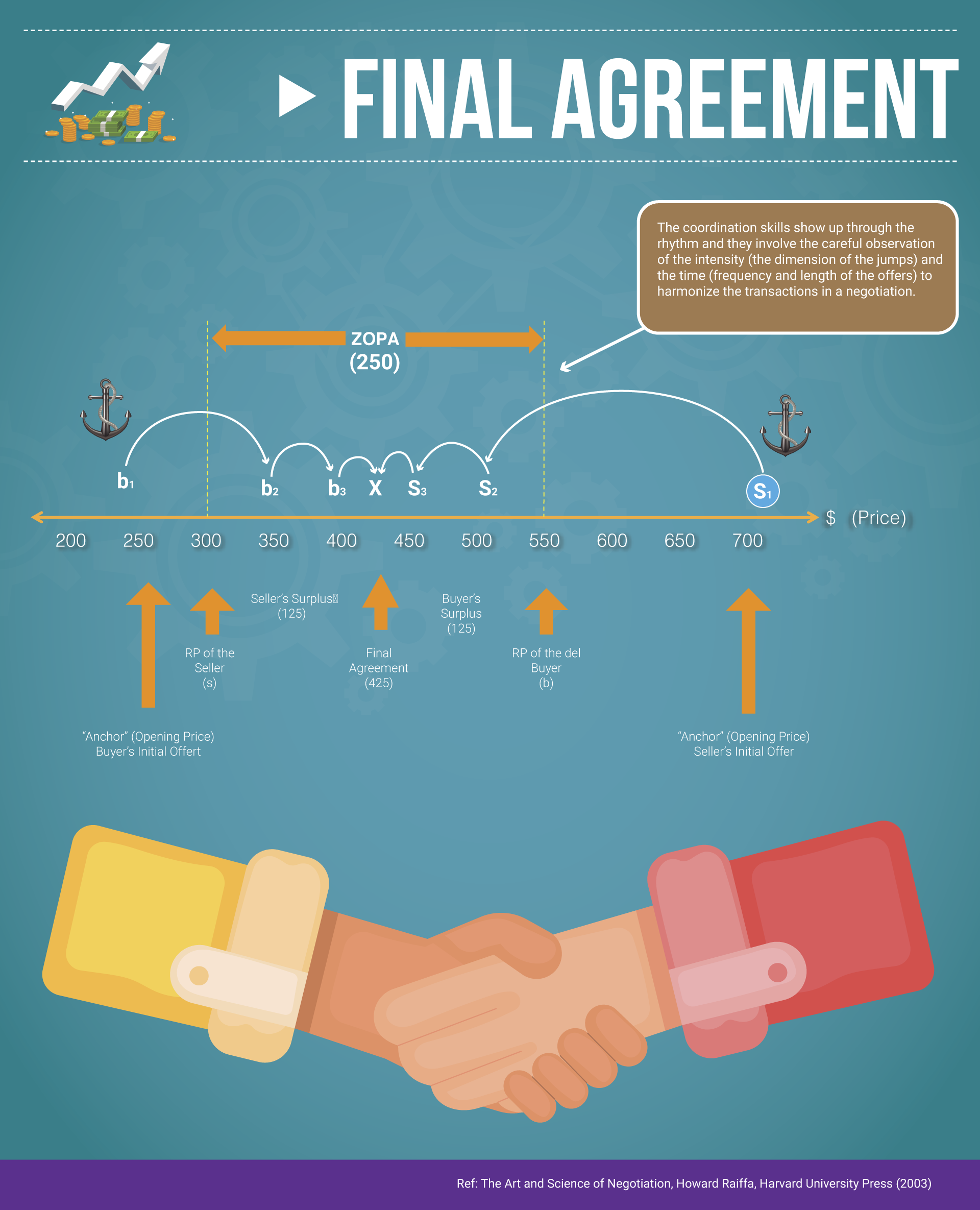 The first offer is made, known as the anchor or opening of the negotiation. The term “rhythm” in the negotiation dance is the combination between the intensity or magnitude of each offer and the time taken to make them.