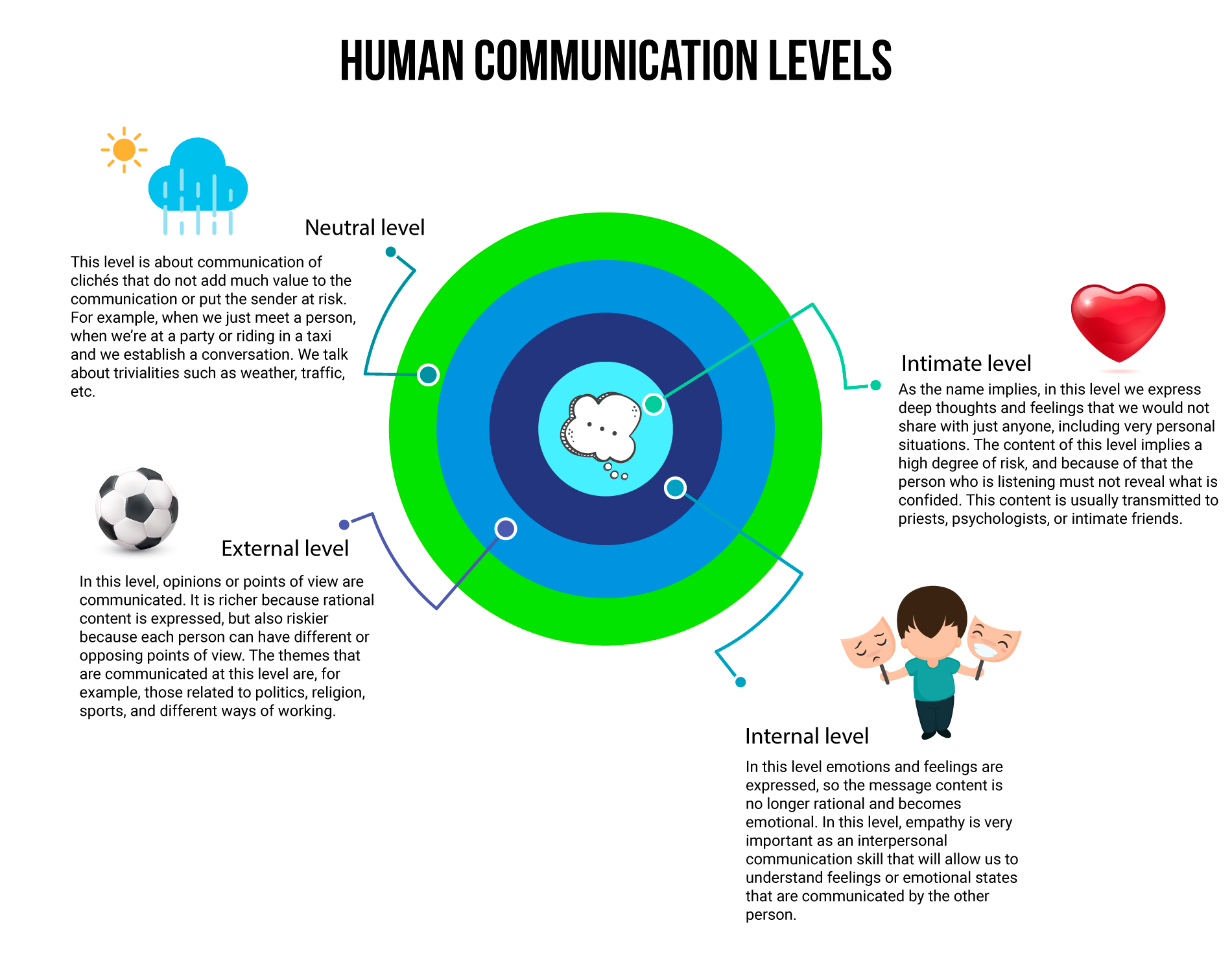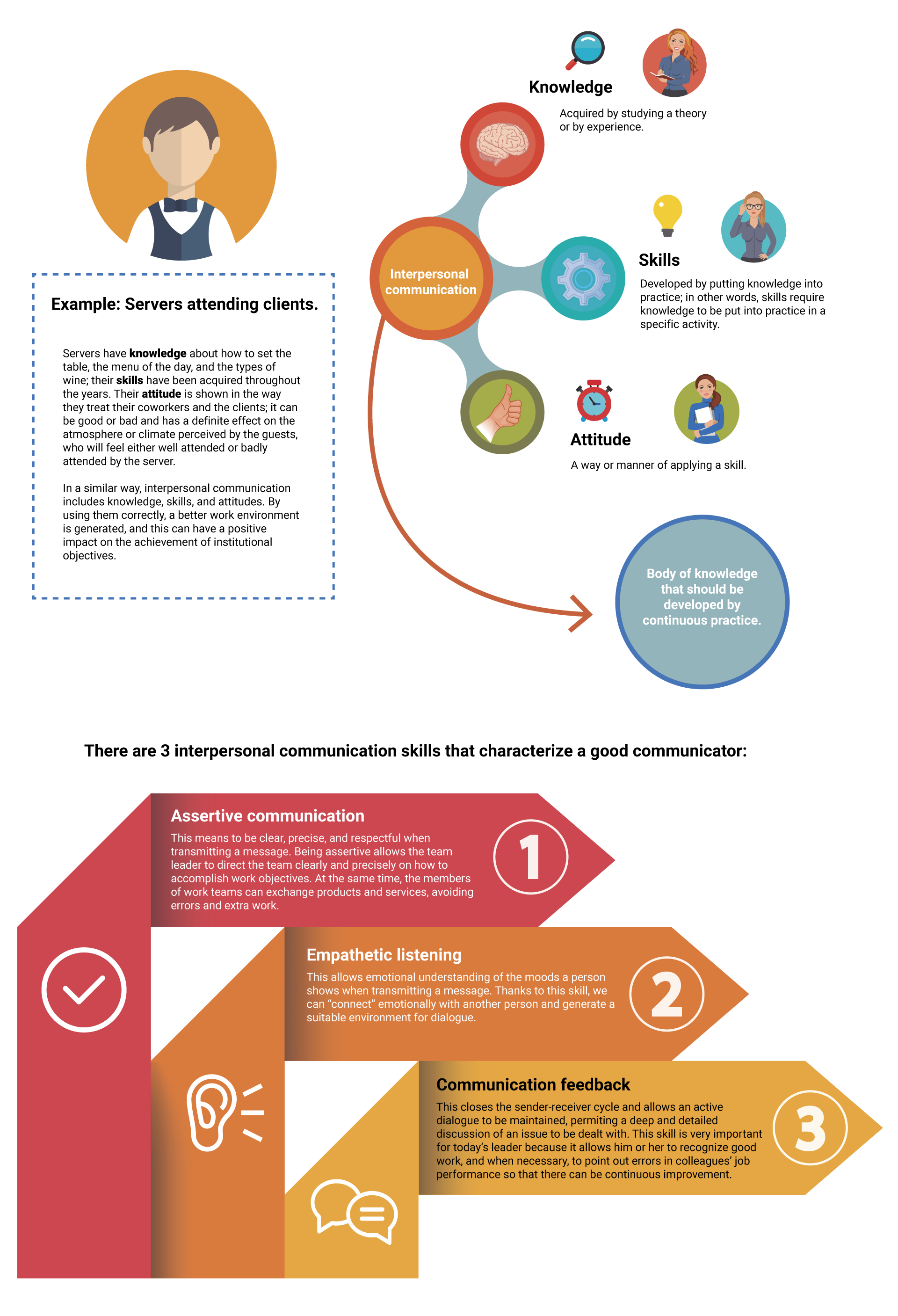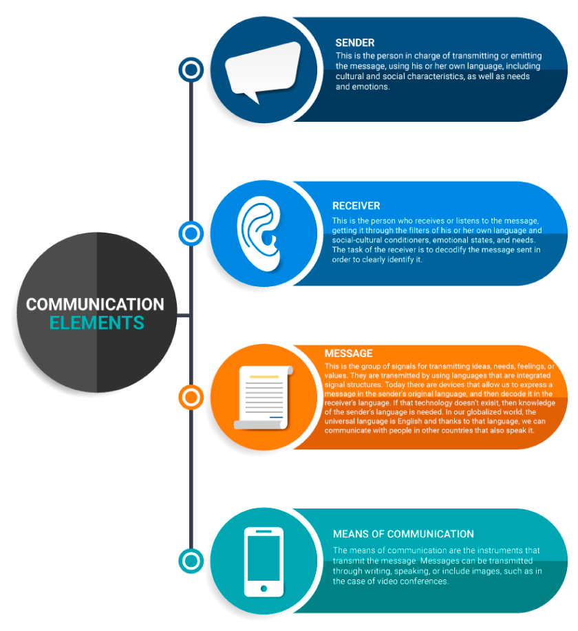 Infographic showing communication elements, the 4 communication levels, interpersonal communication skills - assertive communication, empathetic listening and communication feedback